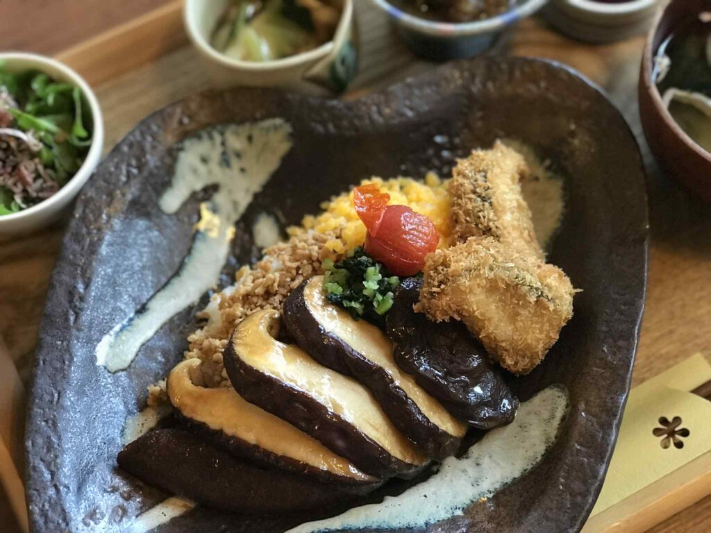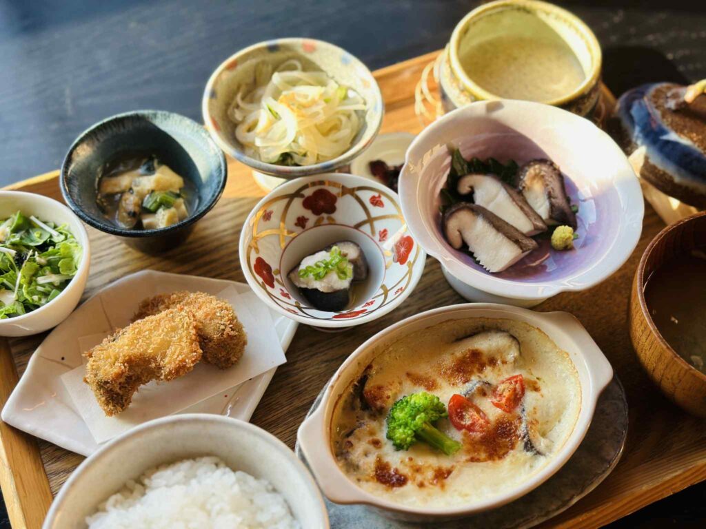 岡部丼にもあるしいたけのフライをはじめ、しいたけのすりながしの茶わん蒸し、煮つけの山掛け、グラタン、お刺身としいたけ尽くしのごちそう定食!!